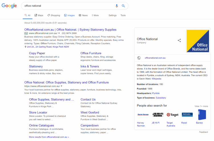 Organization – Organization structured data helps to enhance brand presence by populating the knowledge panel area to the right of the search results with company information. Having the knowledge panel populated increases not only click-through but also user trust – often only noteworthy organizations have this field.