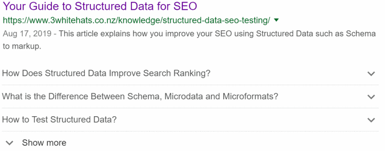 FAQ Schema – If you have an FAQ section on your website, this is a great schema to use. By using this schema, you may be eligible to receive a rich result for certain searches. The answer to the search question can appear, with a list of other frequently asked questions regarding your product or service. It makes it easy for customers to find out about your product or service, and this can often lead to a click through to your site.
